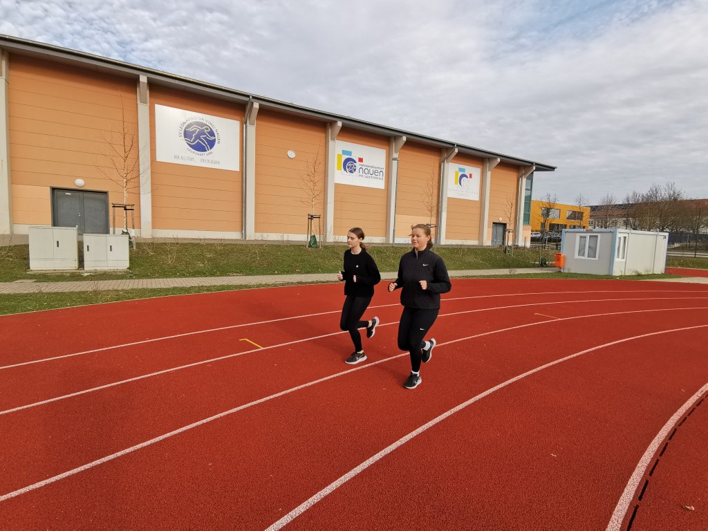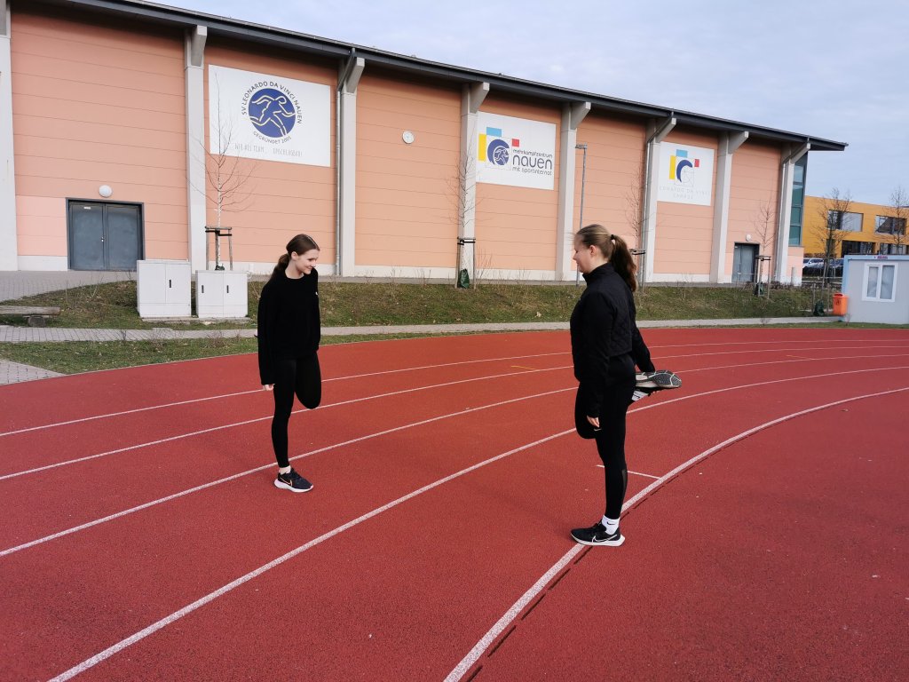 Mia: Und dann lernen wir natürlich auch wie man sich richtig erwärmt. Wir müssen dann selbst eine Erwärmung gestalten, und zwar eine allgemeine und eine spezifische Erwärmung. Das ist vor allem wichtig, da man sich je nach Sportart anders aufwärmen muss. Zum Beispiel beim Kugelstoßen macht man eher was für die Arme und bei Sprint natürlich eher was für die Beine.